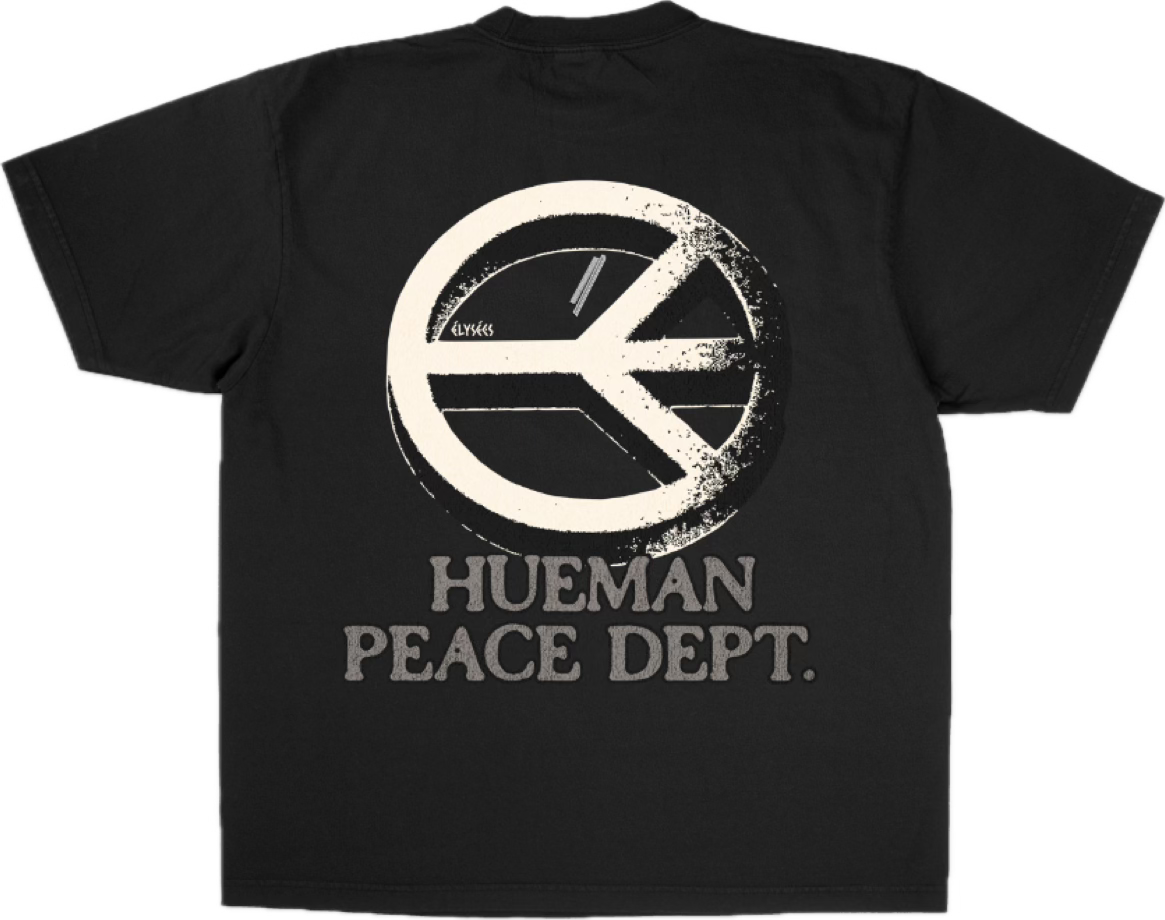 Make a statement with the Élysées Hueman Peace Dept. Tee. This black, premium cotton t-shirt features a striking, distressed peace symbol graphic on the back, embodying a message of unity and positive change. The bold "HUEMAN PEACE DEPT." lettering adds an urban edge, making this piece a standout addition to your streetwear collection. Crafted for comfort and style, this tee is perfect for everyday wear and sparking meaningful conversations.